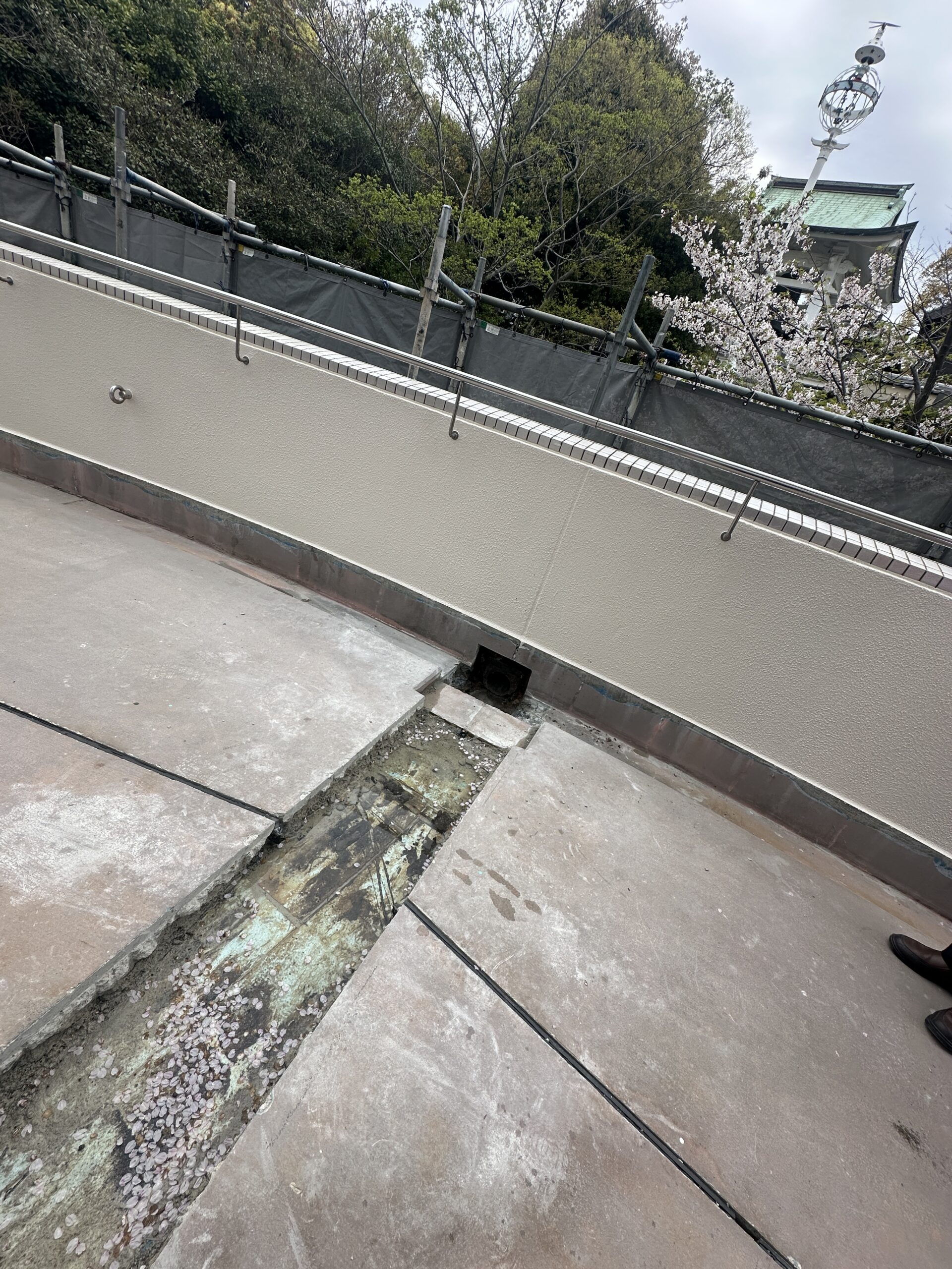 屋上防水工事でカバーを外しています。溝のところが、ちょうど子午線上にあります。