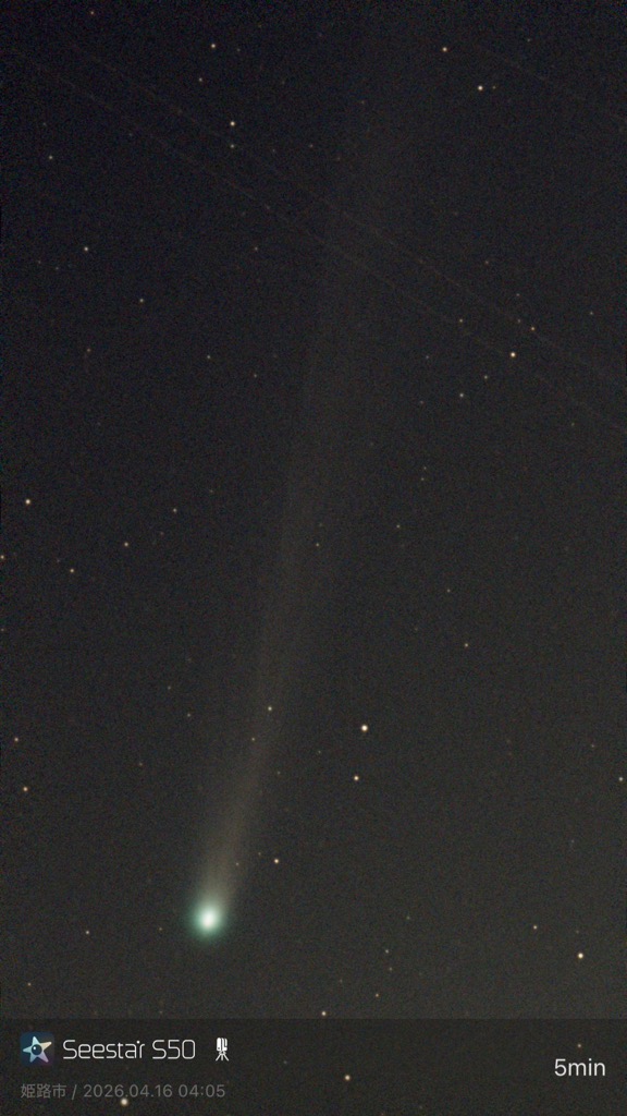 夜明け、雨上がりの東の空に、パンスターズ彗星(C/2025 R3)の姿確認。ペガススの四辺形の中を移動中。だいぶ低空で、そろそろ見納めです。